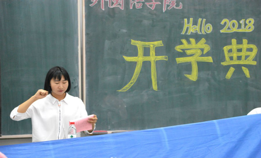 莅临开学典礼的领导、老师分别是:美高梅 院长唐丽萍教授,副院长赵英俊副教授,处级干部史玉新老师,英语系主任马月兰教授,日语系主任杨月枝教授,俄语系主任王洪庆副教授,西班牙语系主任季敏老师,翻译系主任李丽辉老师,商务英语系主任李淑景副教授,法律英语系主任顾维忱教授,二外教研室主任马月秋副教授,教法教研室主任张敬彩副教授,高年级教研室主任赵咏副教授,中英合作办学项目 2018 级业务班主任李旭老师,美高梅 办公室主任孙燕老师,教学秘书郑一波老师,2018 级研究生辅导员曹宝瑞老师,党委办公室秘书、2017 级本科生辅导员霍晨静老师,团委书记、2018 级本科生辅导员陈丽老师,2018 级研究生辅导员王旭老师,2016级本科生辅导员杨金凯老师,2015 级本科生辅导员李小歌老师,2018 级本科生辅导员侯颖老师。