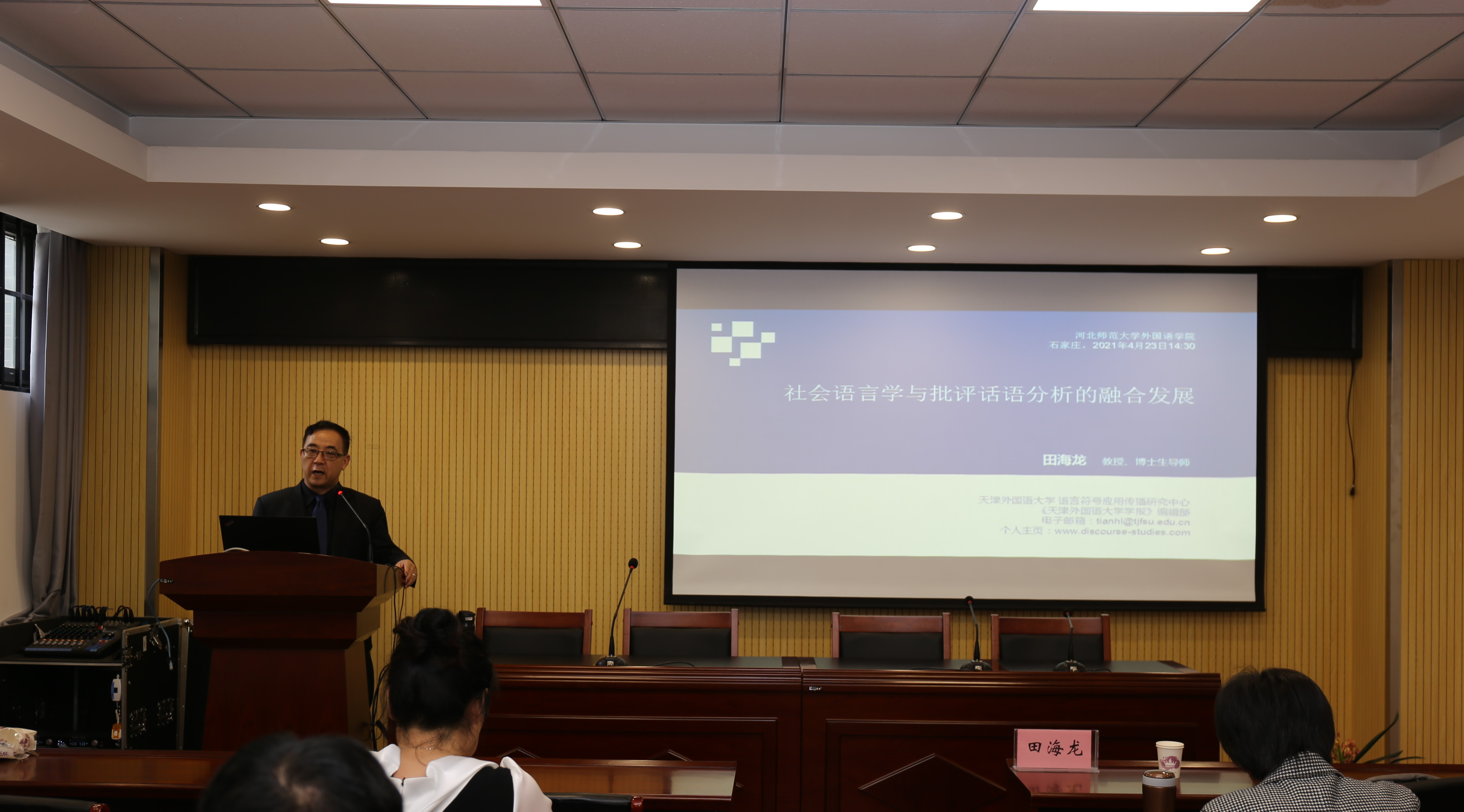 4月23日下午在文科楼B座122教室,天津外国语大学田海龙教授应邀为美高梅 师生做了题为“社会语言学与批评话语分析的融合发展”的专题讲座。讲座由郭小丽副院长主持,相关专业教师、研究生、本科生参与学习交流。